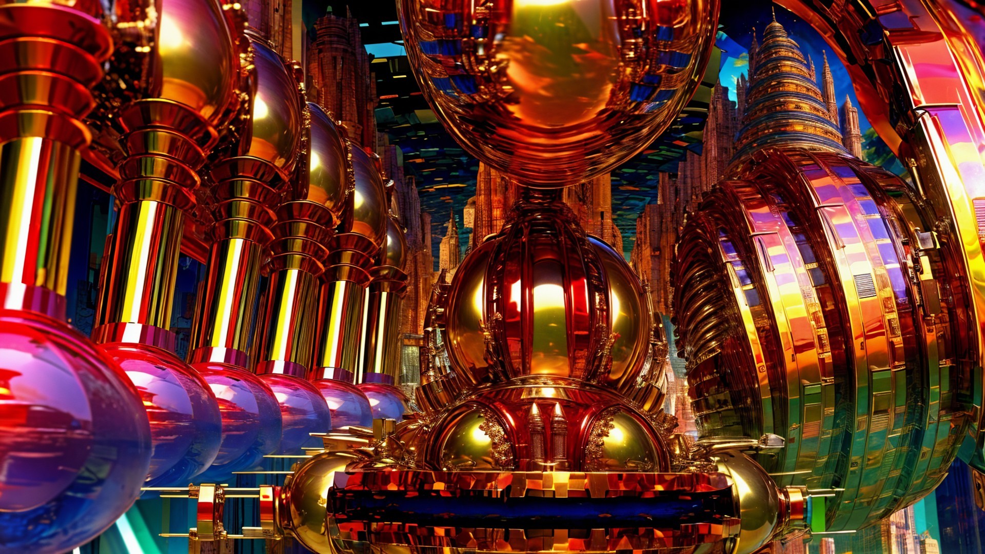 A futuristic scene features shiny golden spheres reflecting vibrant hues of blue and pink, set against a backdrop of towering skyscrapers, creating a striking interplay of light and color.
