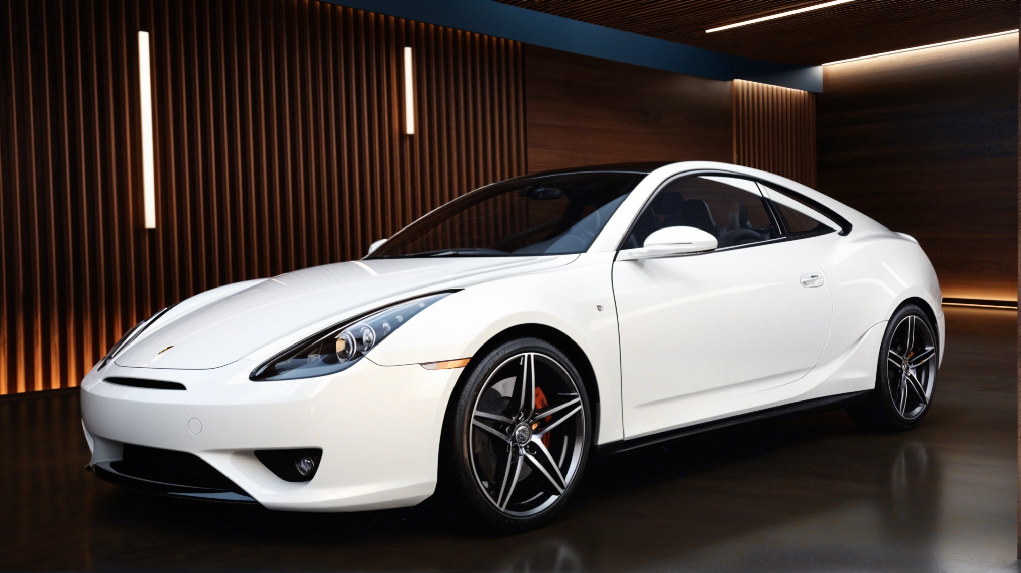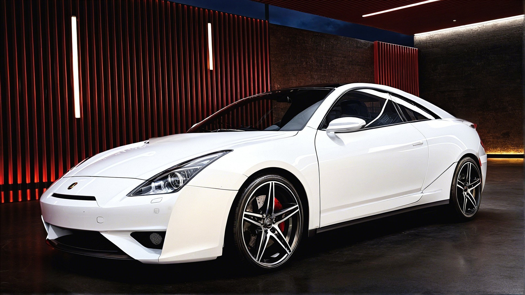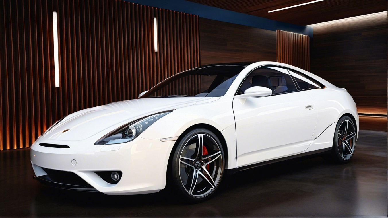 A sleek, white sports coupe with a streamlined design and stylish alloy wheels. It features a modern interior, showcasing luxury alongside performance, highlighted by dramatic lighting.