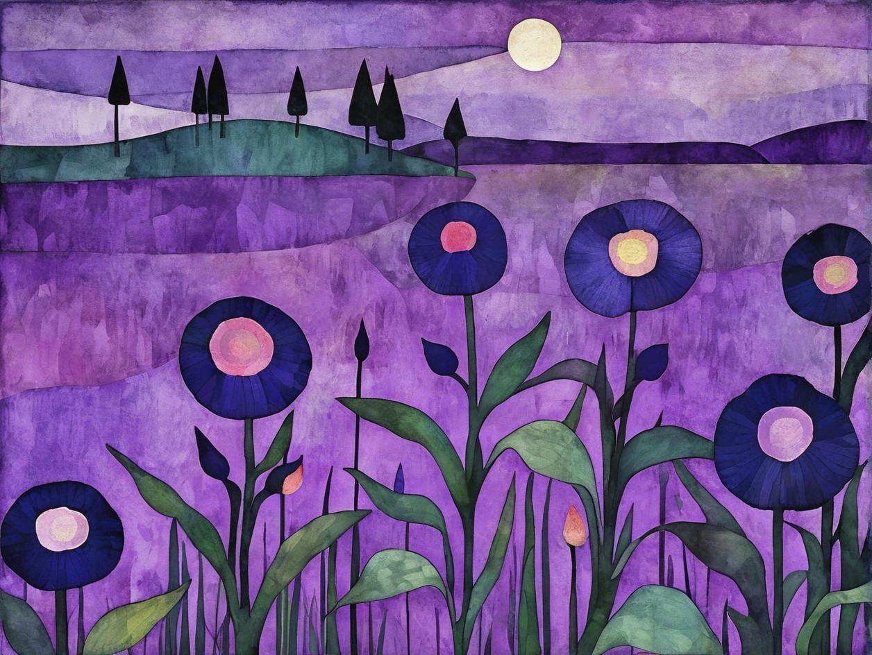 A serene, whimsical landscape features vibrant purple flowers with yellow centers, set against a twilight background of rolling hills and a soft, glowing moon. Tranquil and artistic.