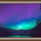 A serene night scene features a majestic deer near a cozy cabin by a lake, with a vibrant sky of purple and turquoise hues illuminated by stars and a crescent moon. Pine trees surround the landscape.