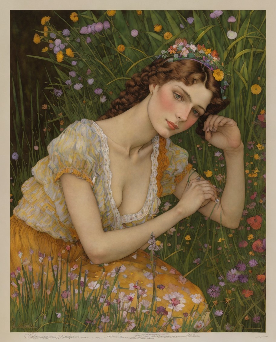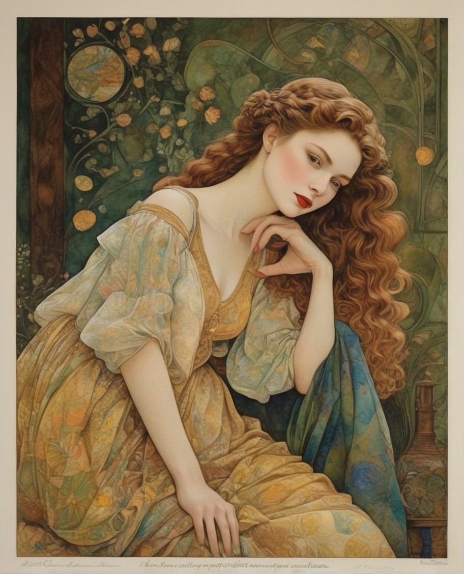 A painting of a contemplative woman with flowing red hair, wearing a vintage dress against a backdrop of green foliage.