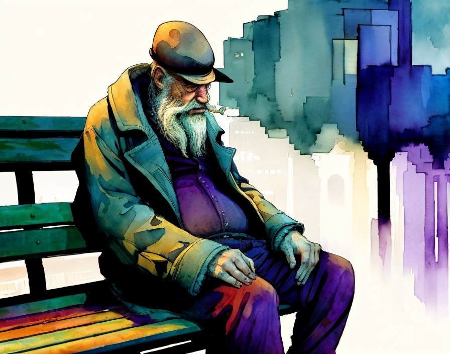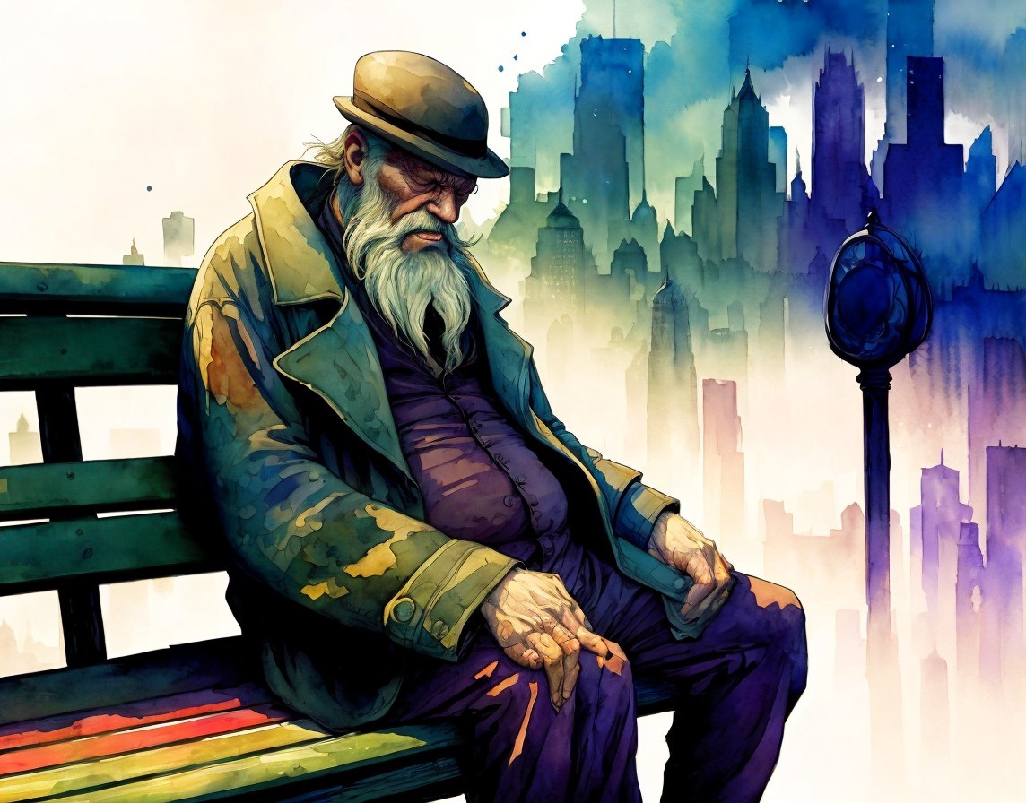 An old man sits on a bench, tired and depressed, city skyline in far distant background.