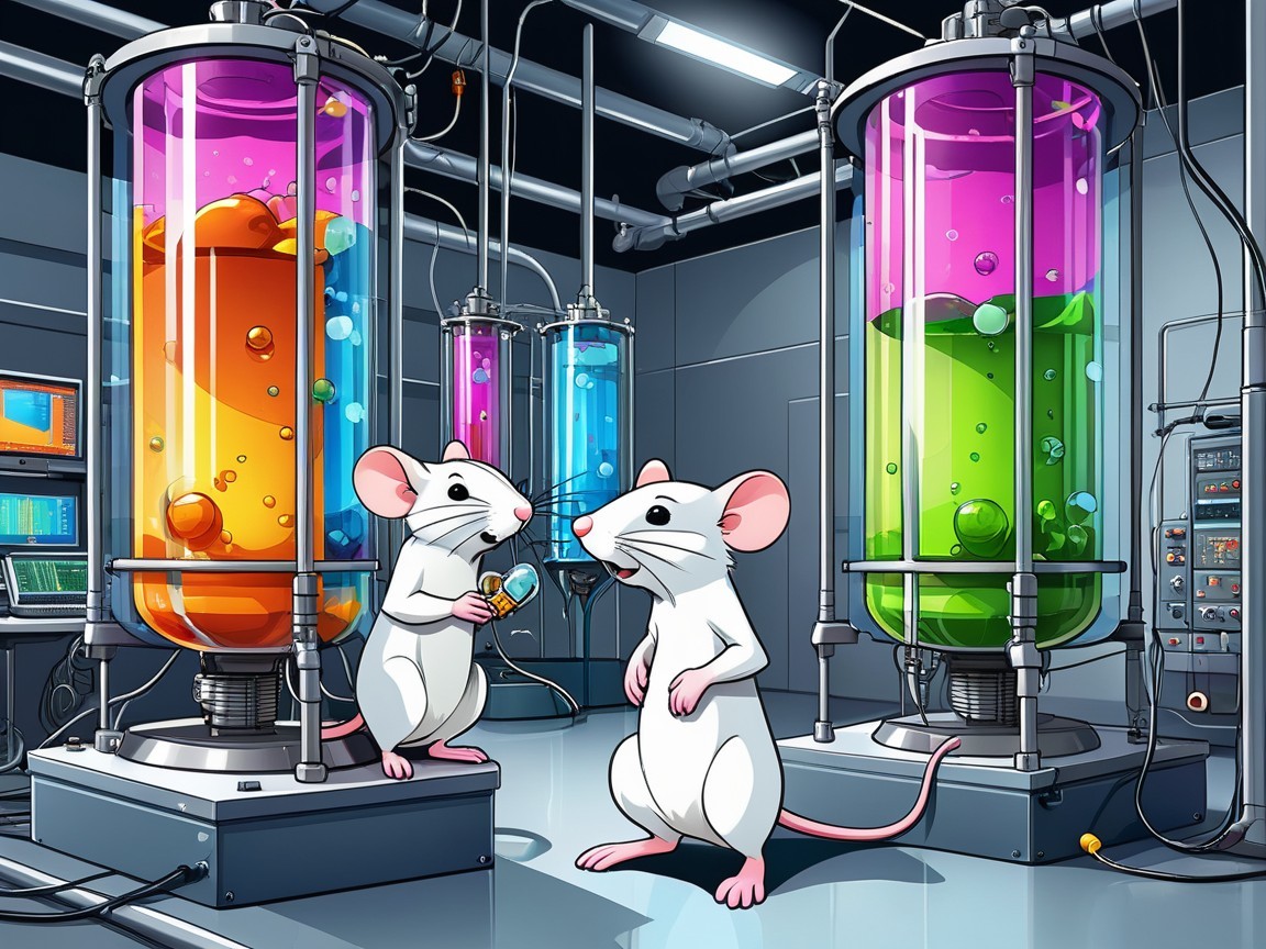 In a laboratory, two cartoon mice stand beside colorful glass tubes filled with vibrant liquids. The setting is high-tech, with various screens displaying data. The mice appear curious and playful.