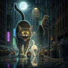 In a dark, moonlit city, giant cats dominate the street, accompanied by smaller feline companions. Neon signs glow as they roam past garbage-filled alleyways, creating a surreal urban scene.