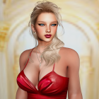 A stunning woman in a flowing red dress poses elegantly, exuding confidence. Her blonde hair cascades softly, and her makeup highlights her striking features against a soft, blurred background.