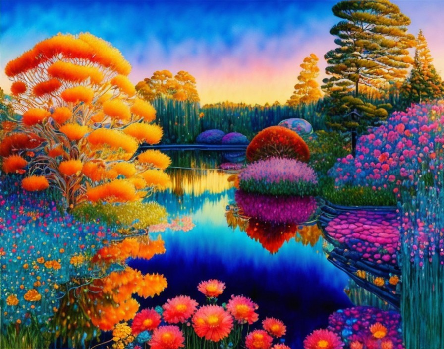 Wide view, 3D watercolor patchwork, in the very best style of Gustav Klimt, spectacular sunrise, a topaz pond reflecting a beautiful garden with numerous flowers in vibrant saturated colors, slender trees and plants with delicate leaves in shades of azure blue and teal and gold, golden sunrise rays shimmering over the scene, detailed intricate, satiny, high quality, elegant, highly detailed, glistening magic style with elements in the style of Jan Toorop