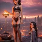 Two women in elaborate Halloween costumes stand in front of a castle at dusk, framed by bats and pumpkins. One wears a witch's hat, while the other has cat ears, both exuding a playful, spooky vibe.