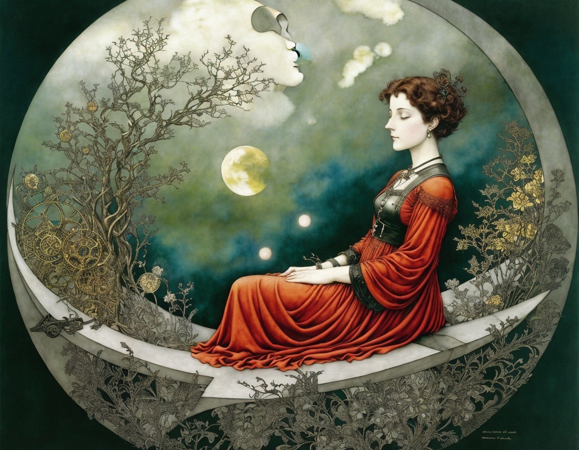 A woman in a red dress sits in a celestial, clockwork setting. Elegant gears and a cosmic backdrop create a dreamlike atmosphere, blending beauty and the mysteries of time and space.
