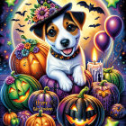 A vibrant, whimsical scene features a cheerful tabby cat in a top hat and bow tie, surrounded by colorful flowers and a sunset backdrop, with a fairy dancing near an open window.