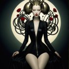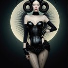 A sleek, futuristic figure with pale skin and striking red lips wears ornate headphones. The background features a large, glowing moon, enhancing the ethereal and sci-fi vibe.