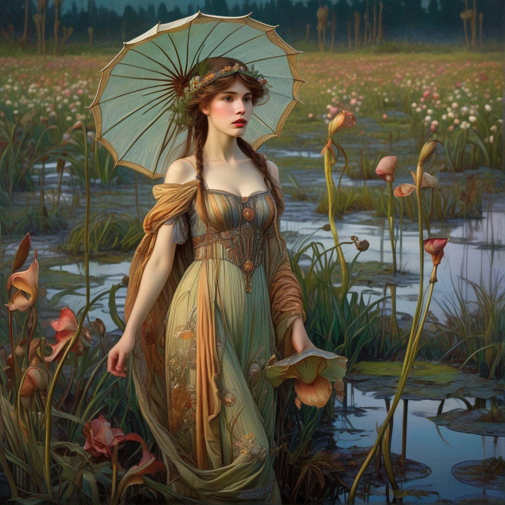 Prompt: Art nouveau, a beautiful young woman walking in a wet marshland populated with carnivorous plants. style Alphonse Mucha and William Waterhouse and van Gogh, at sunset. Hyper-detailed, hyper-realistic, photo-realistic, ornate, meticulously detailed, vibrant colors, meticulous, intricate and highly detailed illustration, watercolour by jean-baptiste monge, by Arthur Rackham, by Paul Klee, hyper-realistic, ornate, meticulously detailed, intricate, highly detailed, illuminated, cinematic lighting. Extremely detailed. Masterpiece.