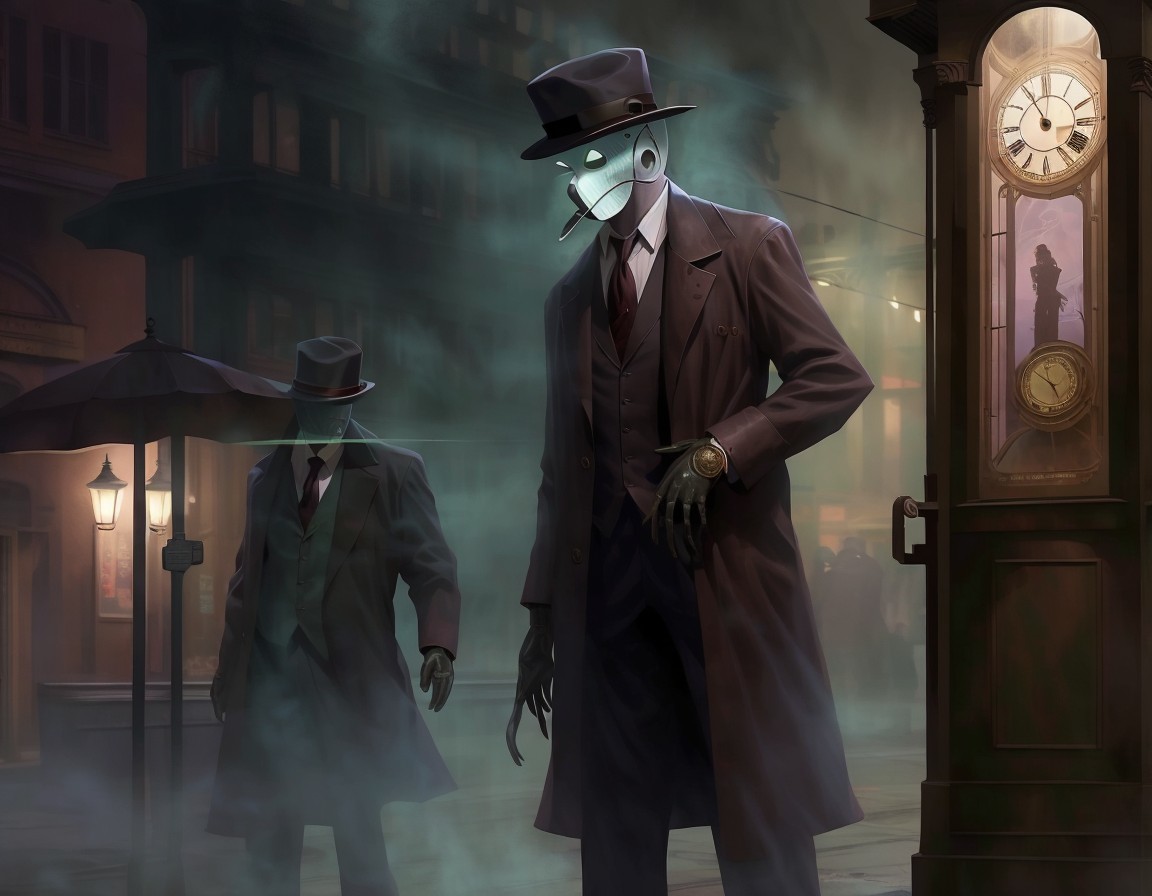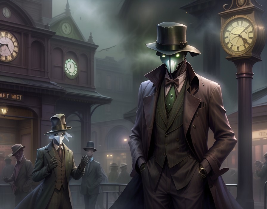 An illustration of a dapper figure with a glowing purple eye wearing a top hat, set against a backdrop of old-fashioned clocks and mysterious figures.