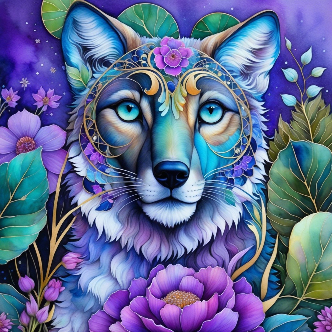 A vibrant, artistic depiction of a wolf adorned with a jeweled headdress, surrounded by lush foliage and colorful flowers, set against a mystical, starry background.