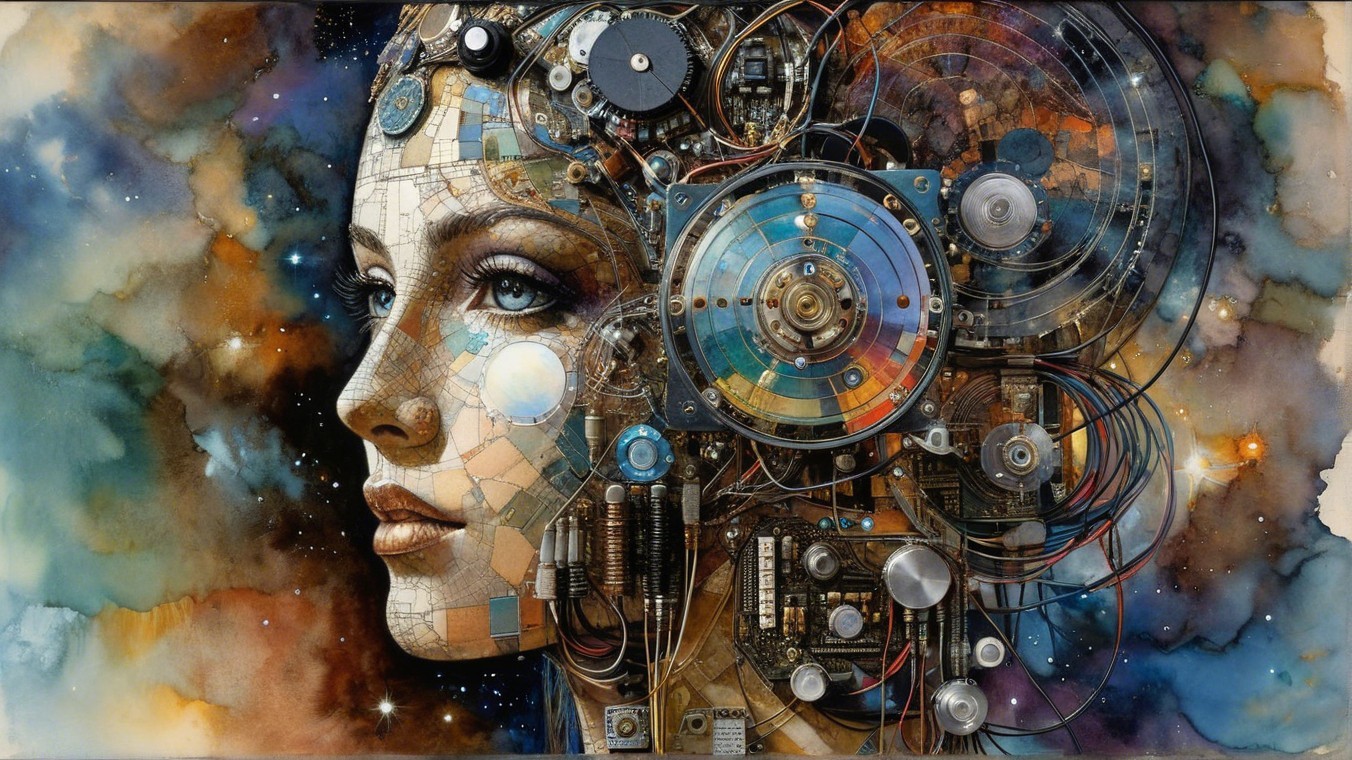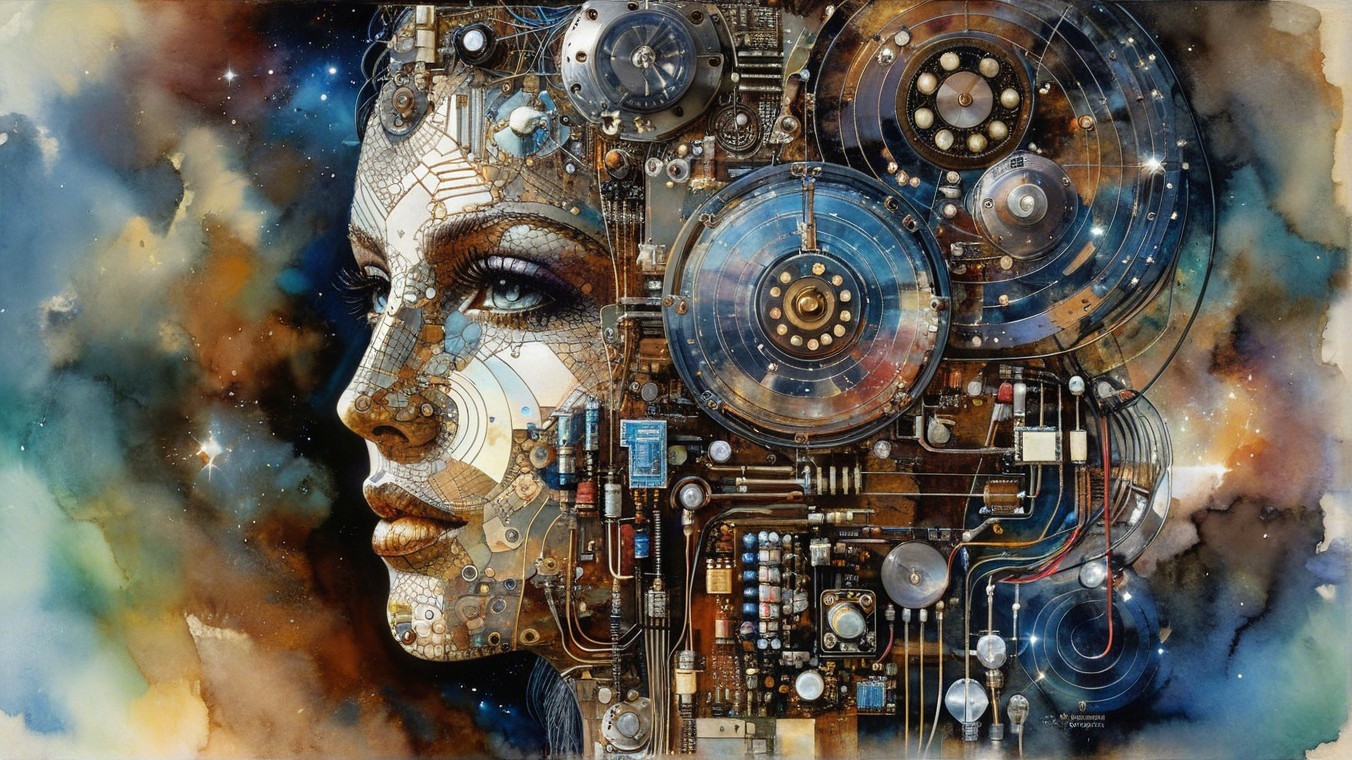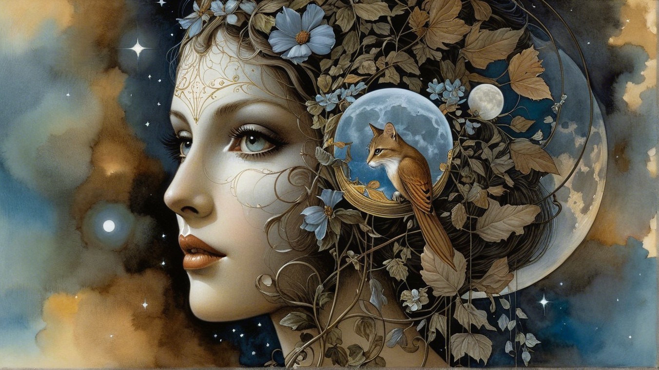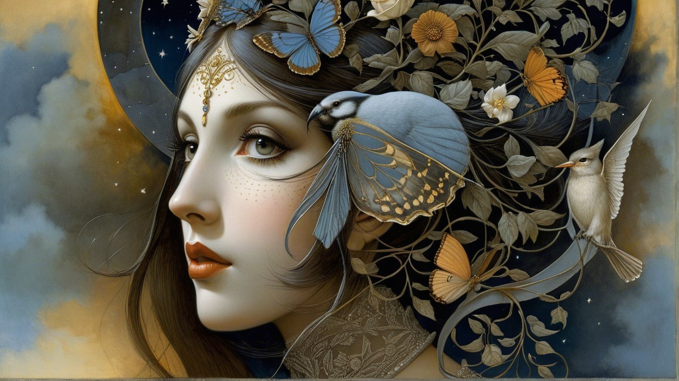 A serene profile of a woman adorned with intricate jewelry and a floral headdress, featuring delicate butterflies and a small bird perched nearby, set against a starry night background.