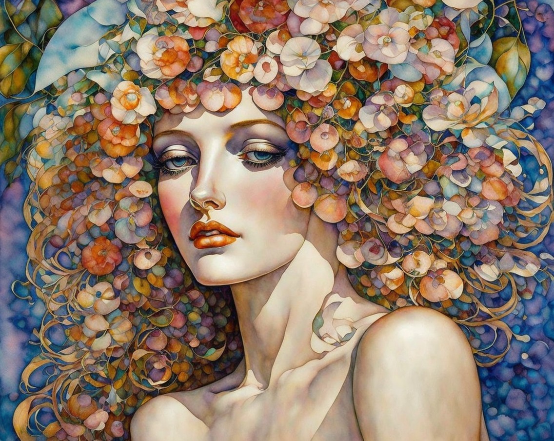 An artwork of a woman with voluminous curly hair and a leafy headdress, featuring striking blue tones and a serene expression.