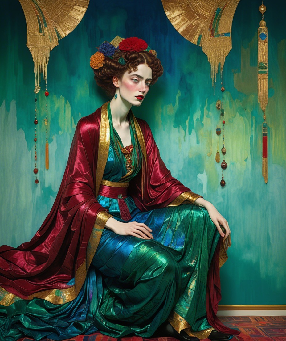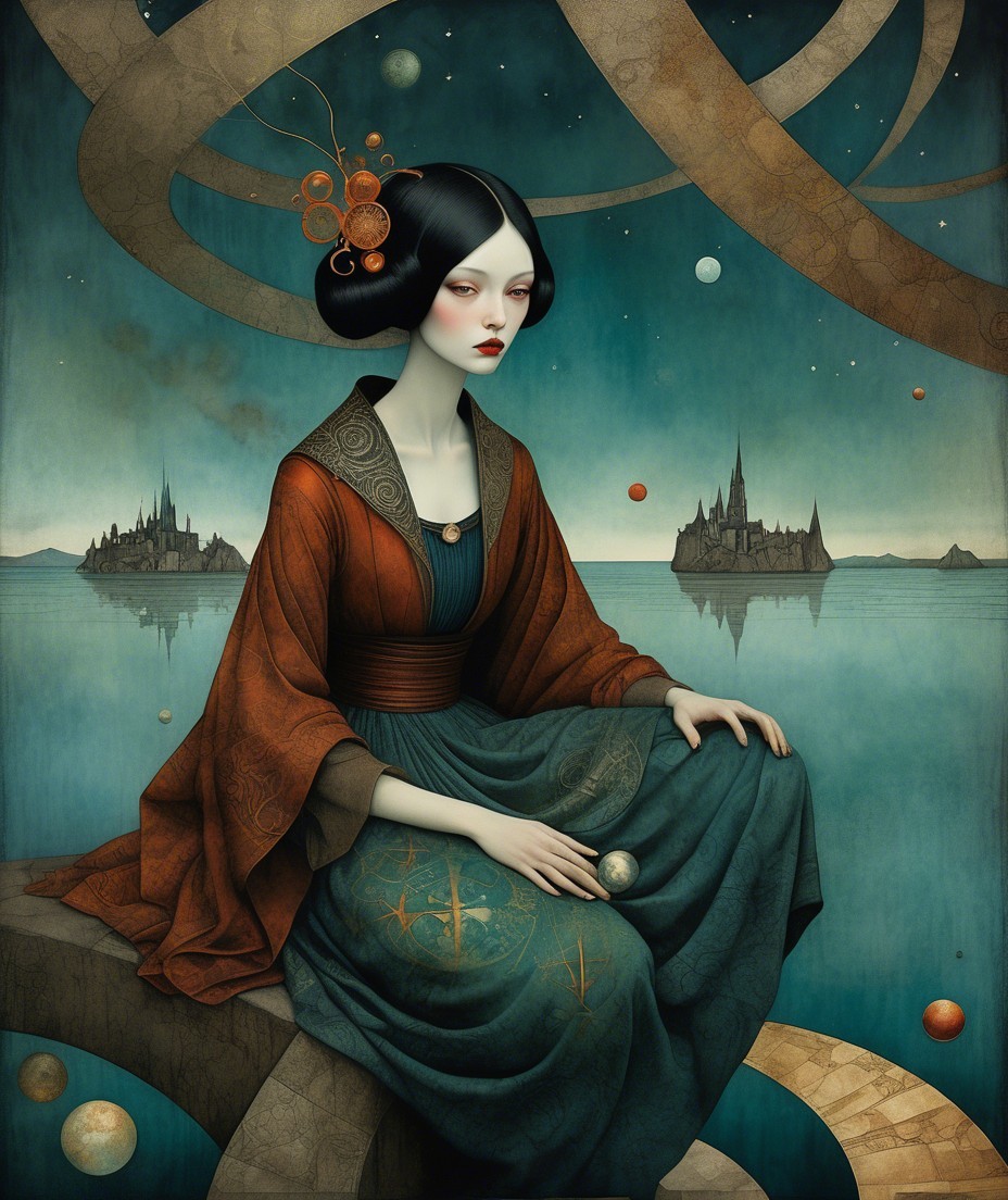 A serene woman with striking red hair sits gracefully in a flowing blue dress and ornate red robe. Colorful hot air balloons float in a dreamy sky, adding to the whimsical atmosphere.