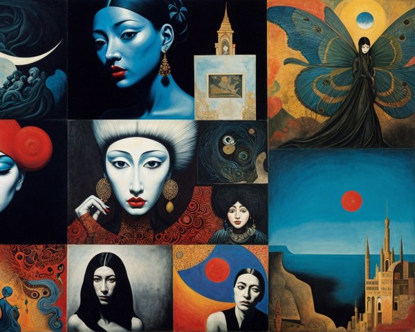 A whimsical scene features a young girl with fiery red hair, sitting among various pumpkins in a rustic setting, veiled in soft cobwebs and shadows, evoking a mystical autumn atmosphere.