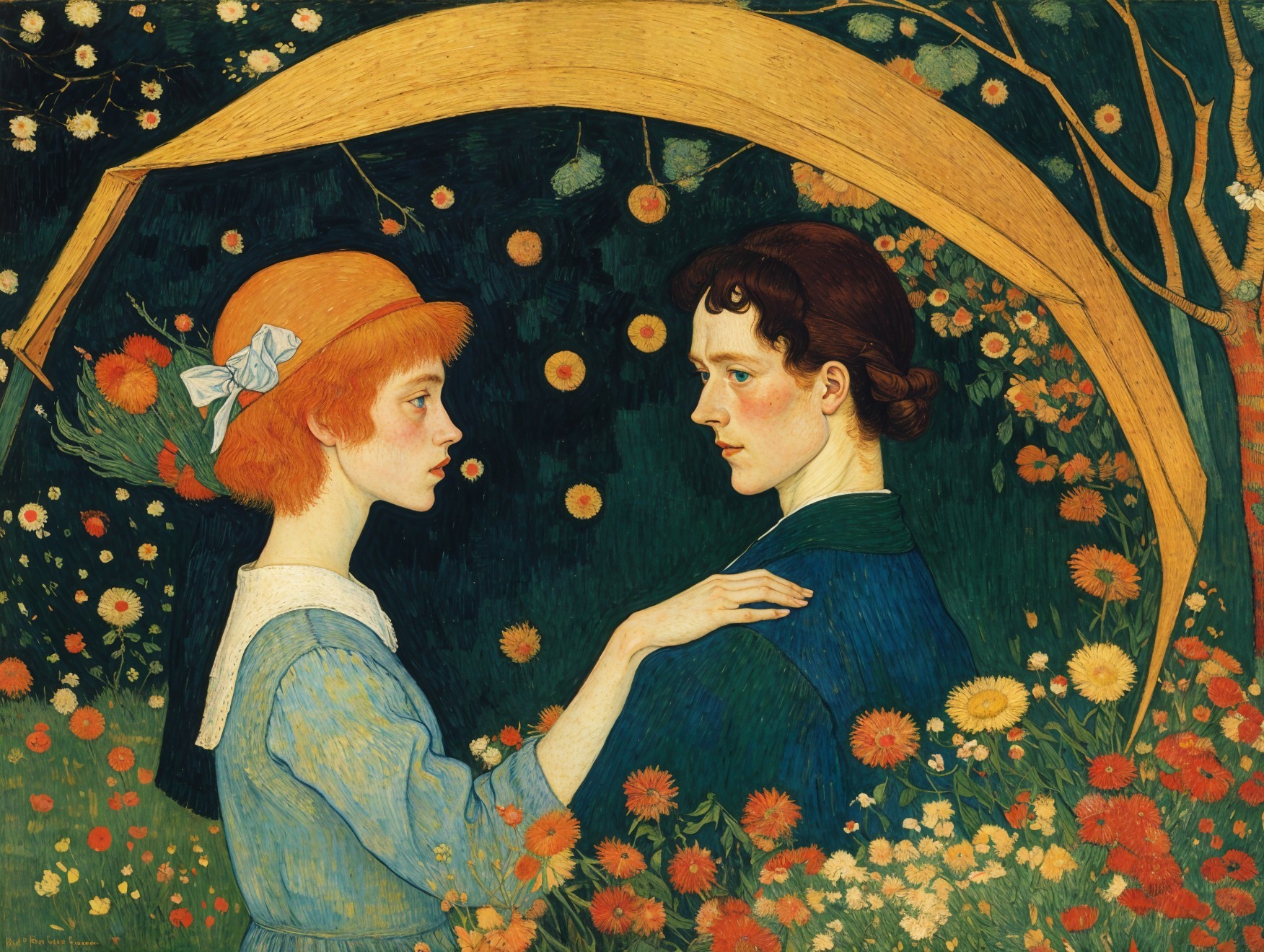 The painting depicts a woman and a man in profile. She gazes softly at him, while he looks intently, adorned in a blue coat with sunflowers. The vibrant circular background enhances their connection.