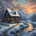 An oil painting shows a charming snow-covered cabin nestled beside a flowing river in a winter wonderland, with a vibrant sunset casting warm hues across the sky. The rustic wooden cabin, with illuminated windows and smoke rising from its chimney, is adorned with colorful garlands of red and yellow flowers. Snow blankets the