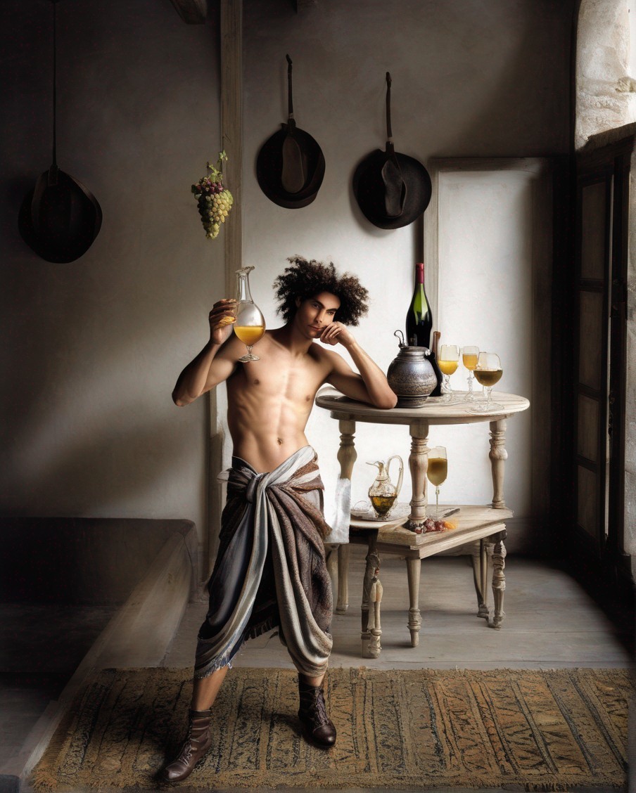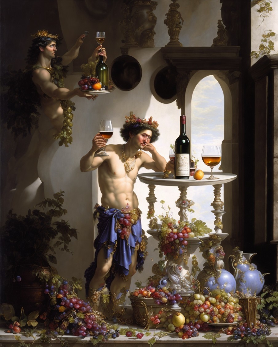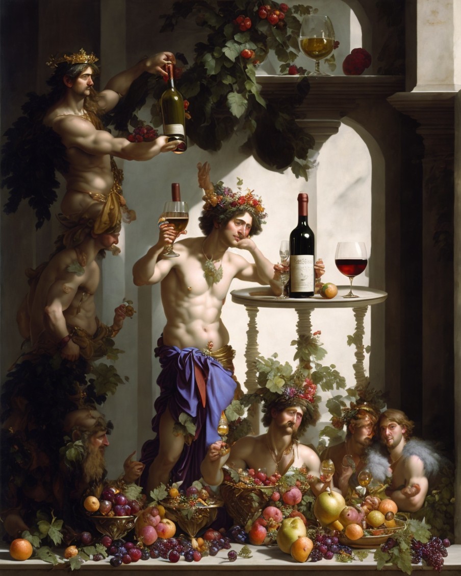 A painting of classical figures, likely mythological, engaged in a Bacchanalian scene with an abundance of grapes, wine, and revelry.