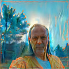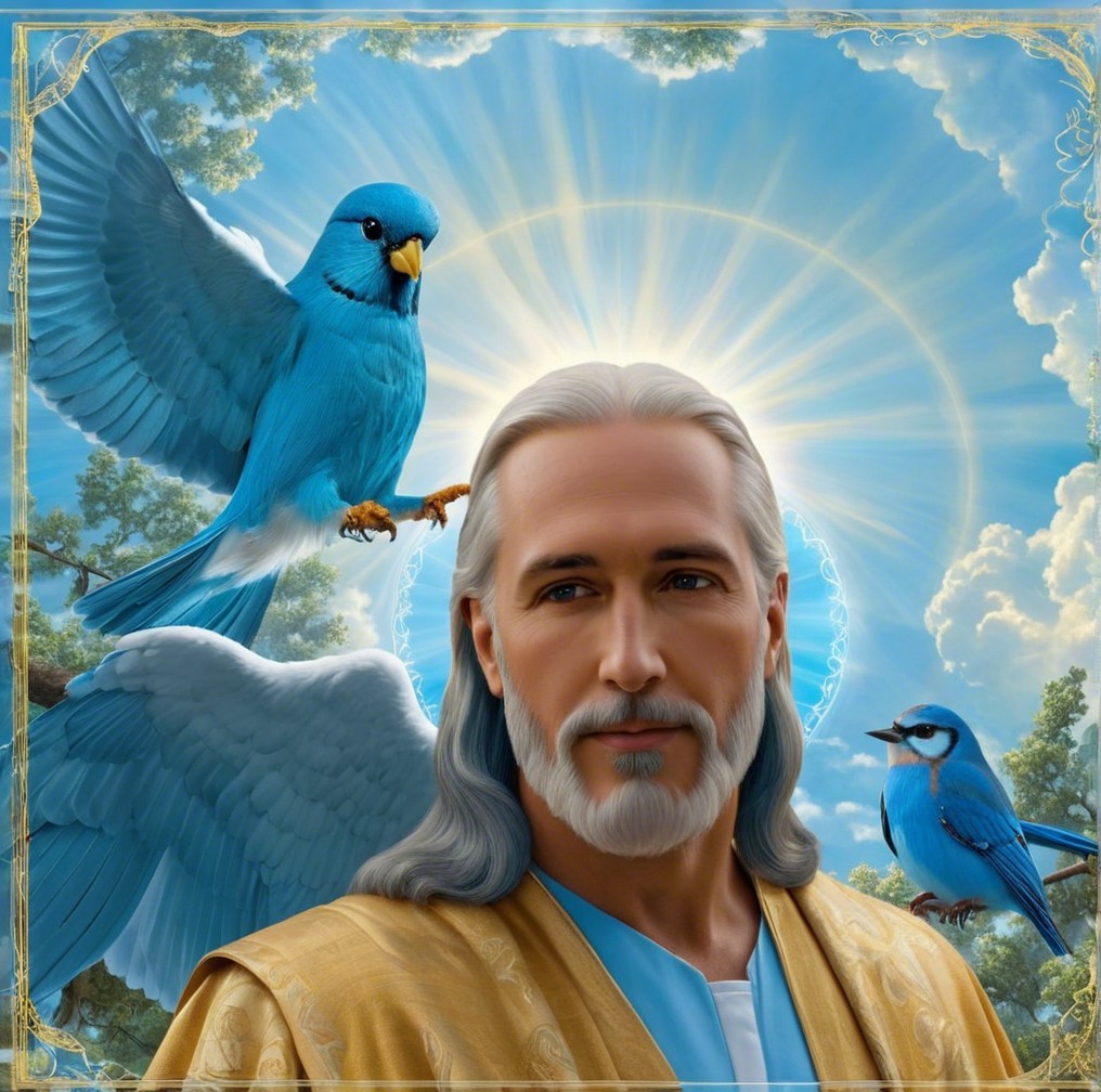 Young man with blue bird in a lush, serene setting