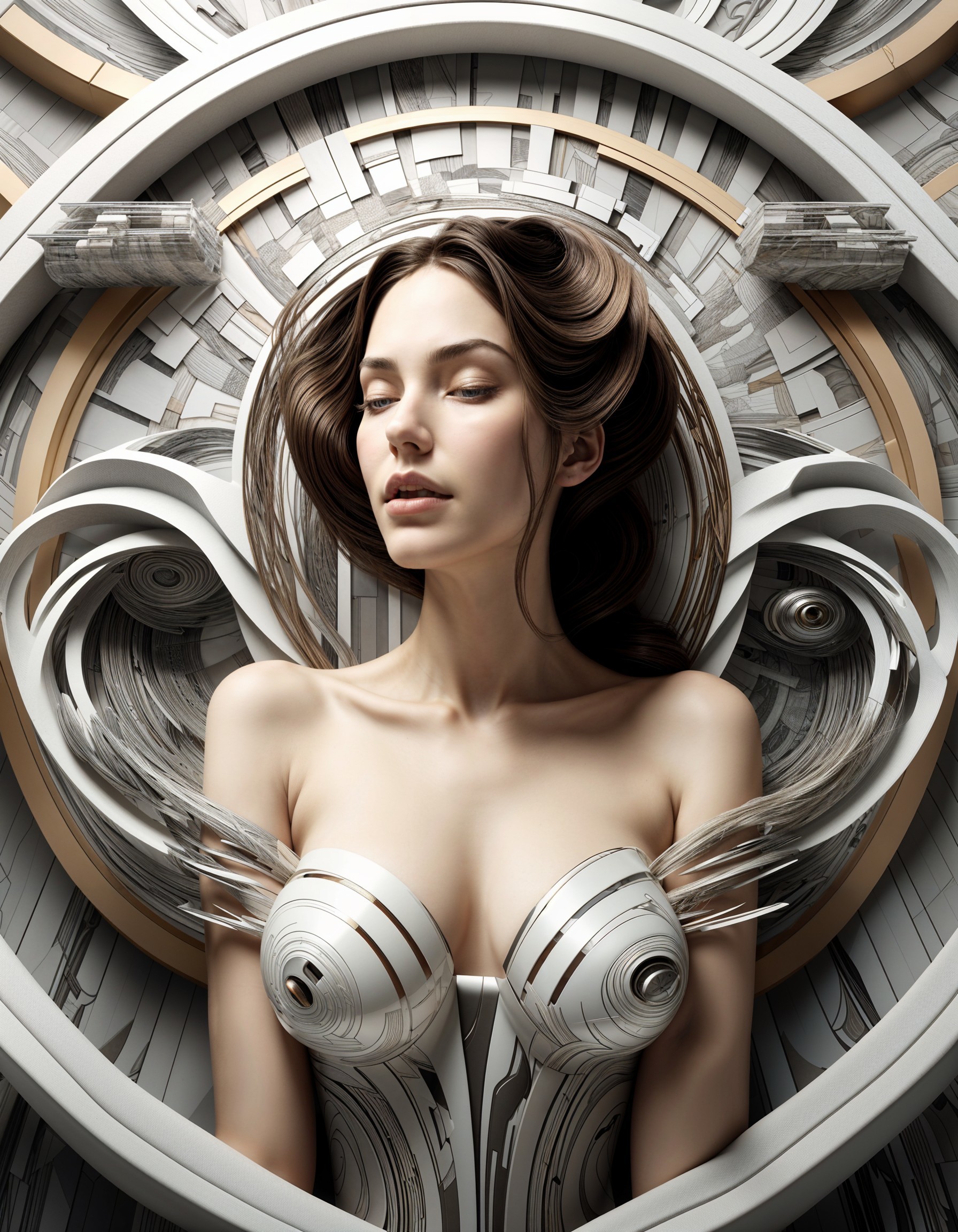 A woman with flowing hair wearing a futuristic white and gold corset with a blue gem centerpiece, set against a circular geometric backdrop.