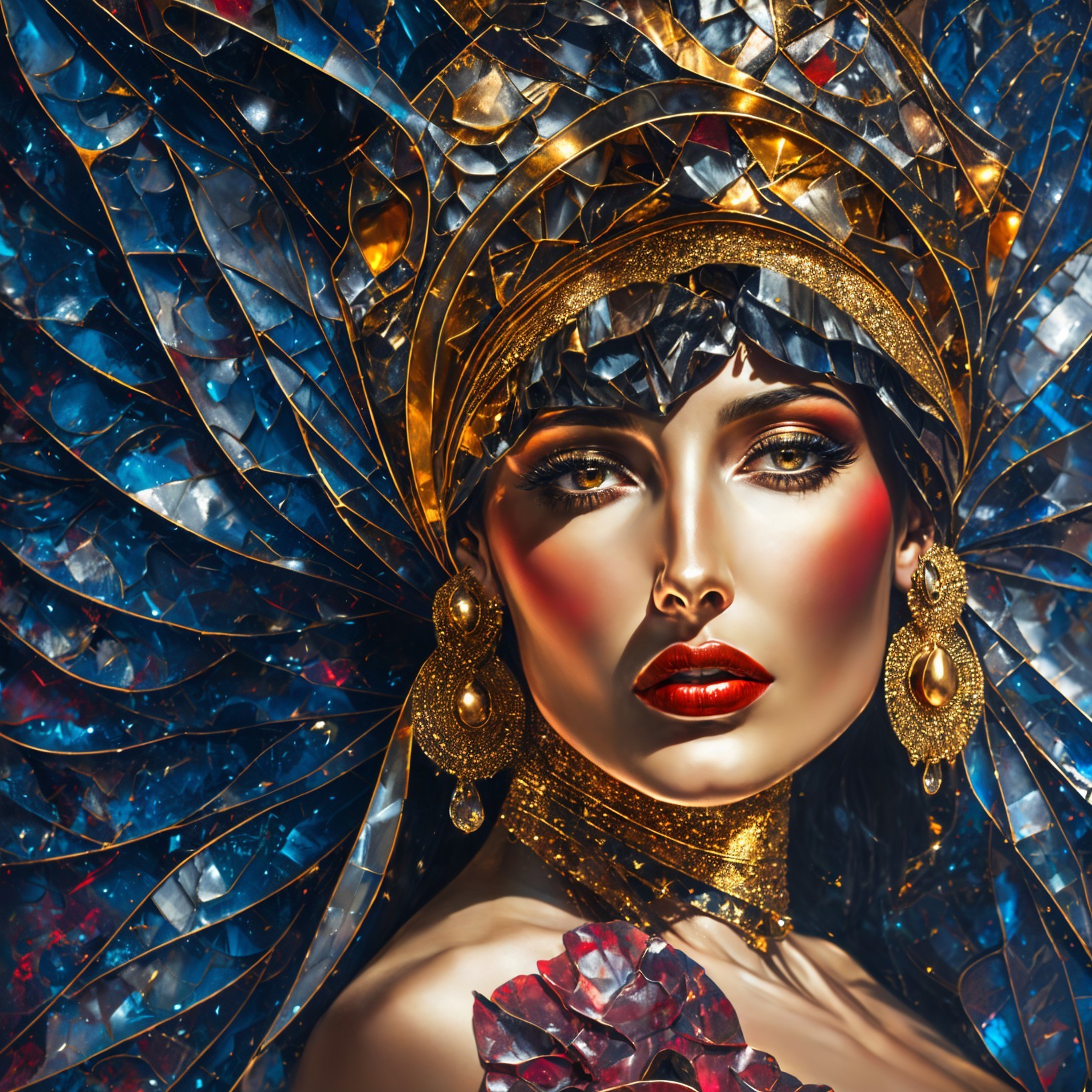 A stunning portrait of a woman adorned with a vibrant headdress made of sparkling gems. Her makeup features bold colors, accentuating her striking features and creating a regal, glamorous look. Original prompt: Neon MF