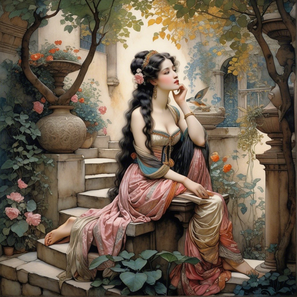 A serene young woman with long hair sits gracefully in a lush, classical garden. Dressed in elegant attire, she gazes thoughtfully at an open book on a pedestal, surrounded by vibrant flowers.