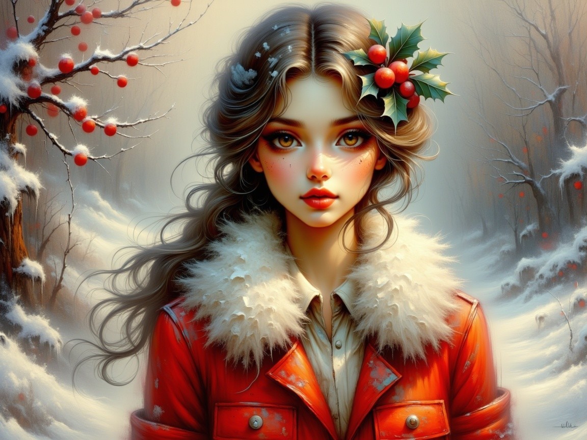 A digital painting of a young woman with a holly branch and berries in her long brown hair. She has big golden eyes with long eyelashes and delicate freckles across her nose and cheeks. Her lips are a vibrant red. She is wearing a cream-colored collared shirt under a red jacket with a