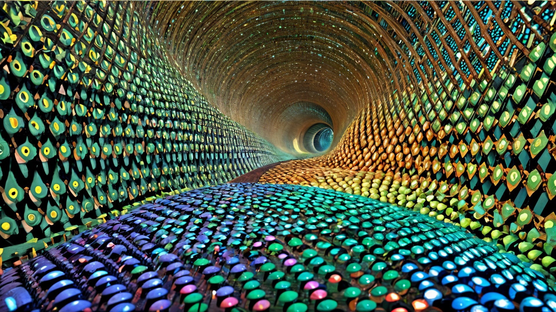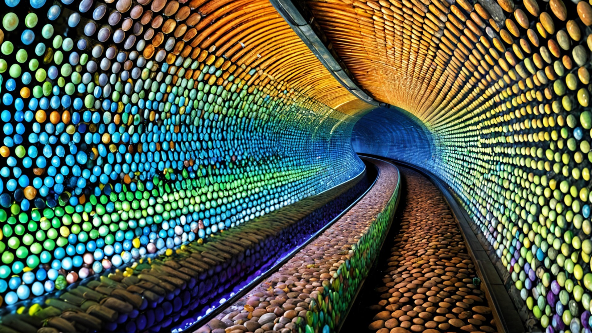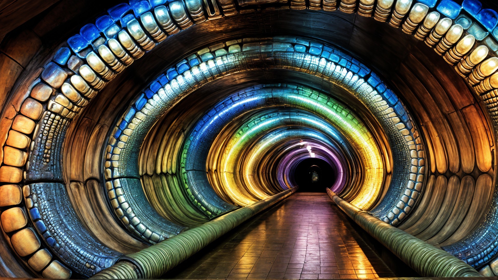 A futuristic tunnel with smooth, metallic walls curves inward, illuminated by a bright opening at the far end. The design features sleek lines and vibrant colors, creating a captivating perspective.