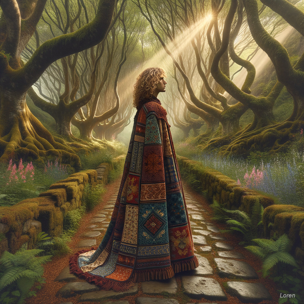 A person with curly hair wearing an ornate cloak stands on a cobblestone path in a mystical, sunlit forest draped in moss.