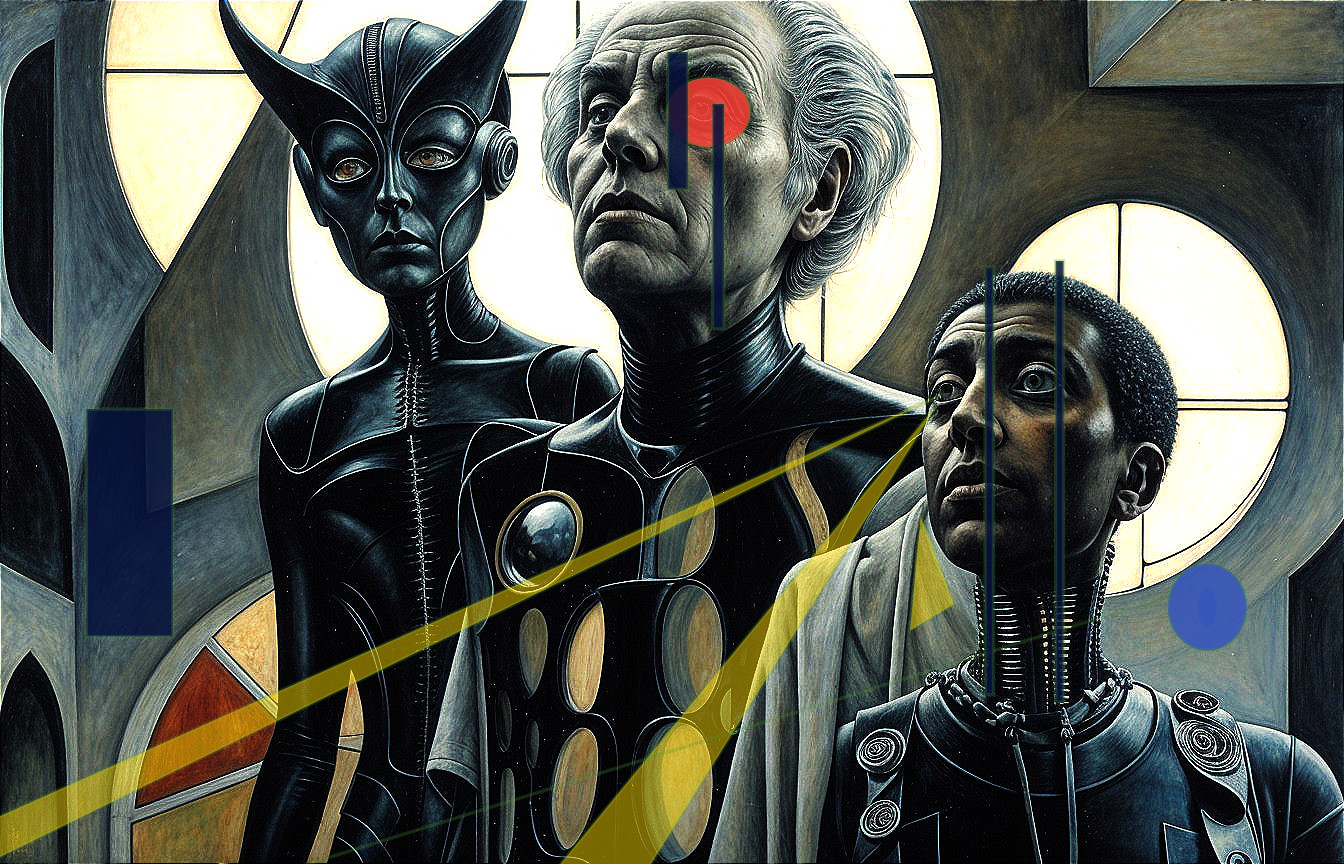 The artwork features four expressive figures in a futuristic setting, characterized by striking features and intense red eyes. Geometric shapes and contrasting colors create a surreal atmosphere.