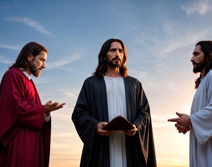 Three Figures in Traditional Jesus Robes Against Sky