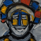 This abstract painting features a stylized face with bold colors, primarily orange, blue, and black. The expressive brush strokes create a textured, dynamic representation of a smiling figure.
