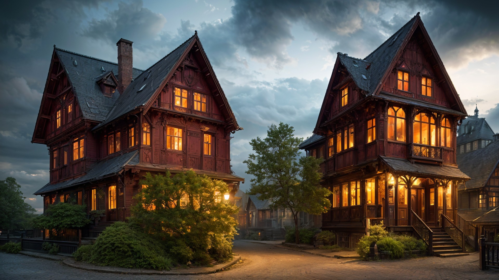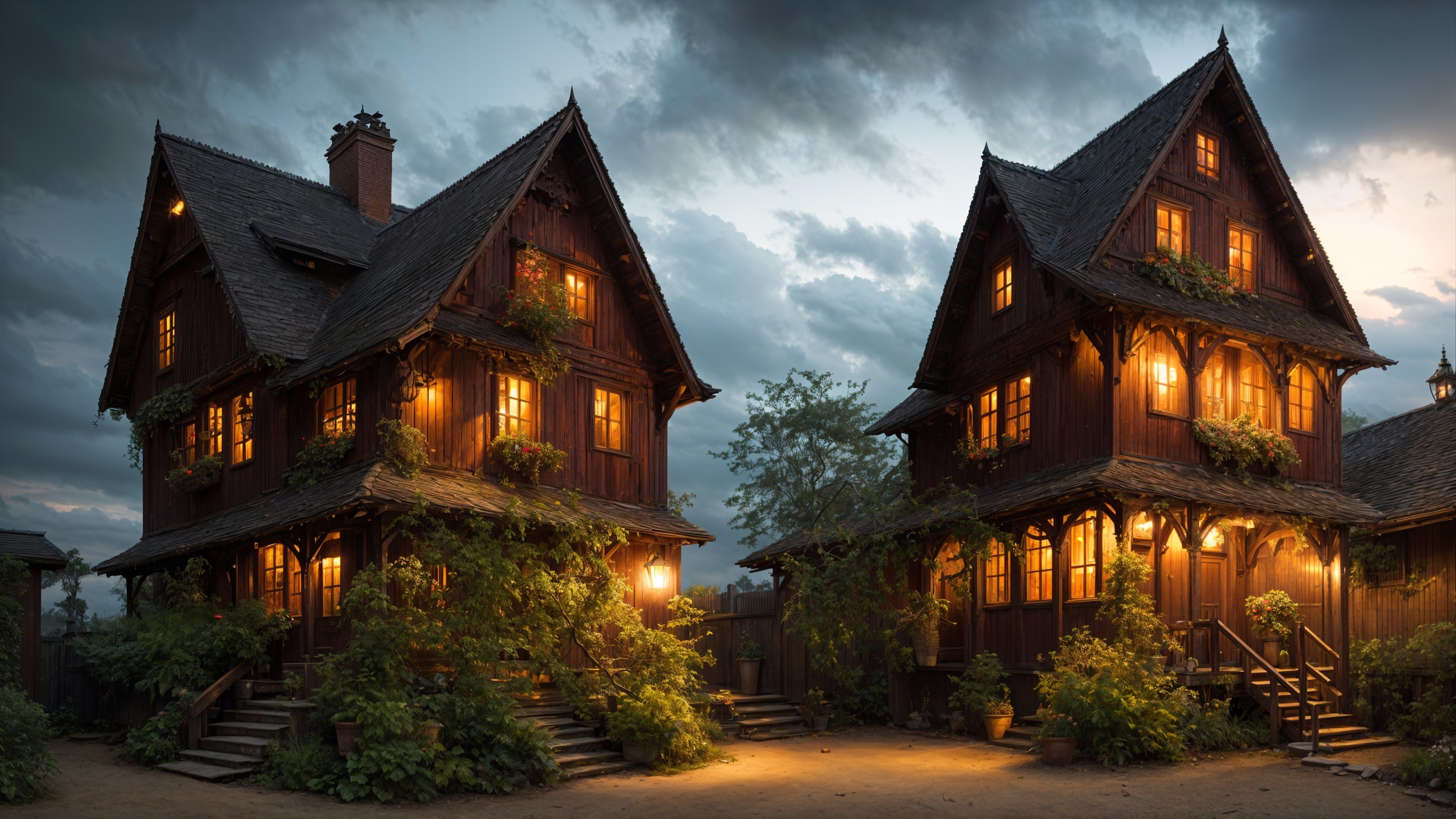 Two enchanting wooden houses with steep roofs, warmly lit windows, and lush greenery. The scene is set under a moody sky, creating a magical, fairy-tale atmosphere.