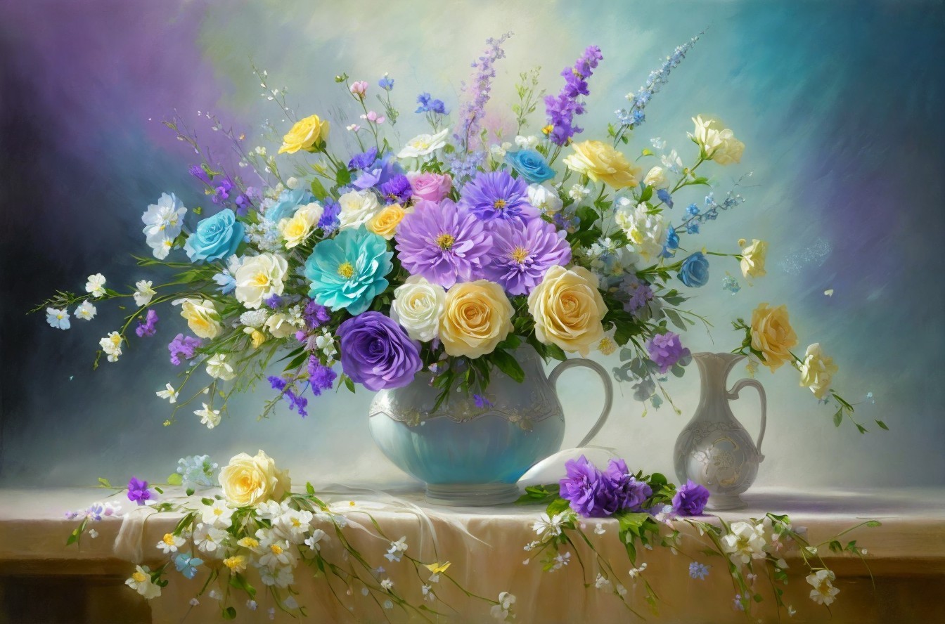 Digital painting. Dreamy pastel background in complimentary colours: blue, violet, soft yellow, white, grey and mint with the main motif a bouquet of various realistic flowers sharply defined painting with pastels and acrylics using pastel sticks, brushes and palette knives. Layering techniques, sfumato soft haze technique, blending, wet on wet. Ethereal haze and silver light mystical mist, beautiful, aesthetic, visual haiku. Stylisation of Mandy Disher, Cecilia Frigati , Svetlana Orinko, Odilon Redon, Melanie Howells and Phil Madley. Full size, no cropping or framing, no text, copyright or watermarks.