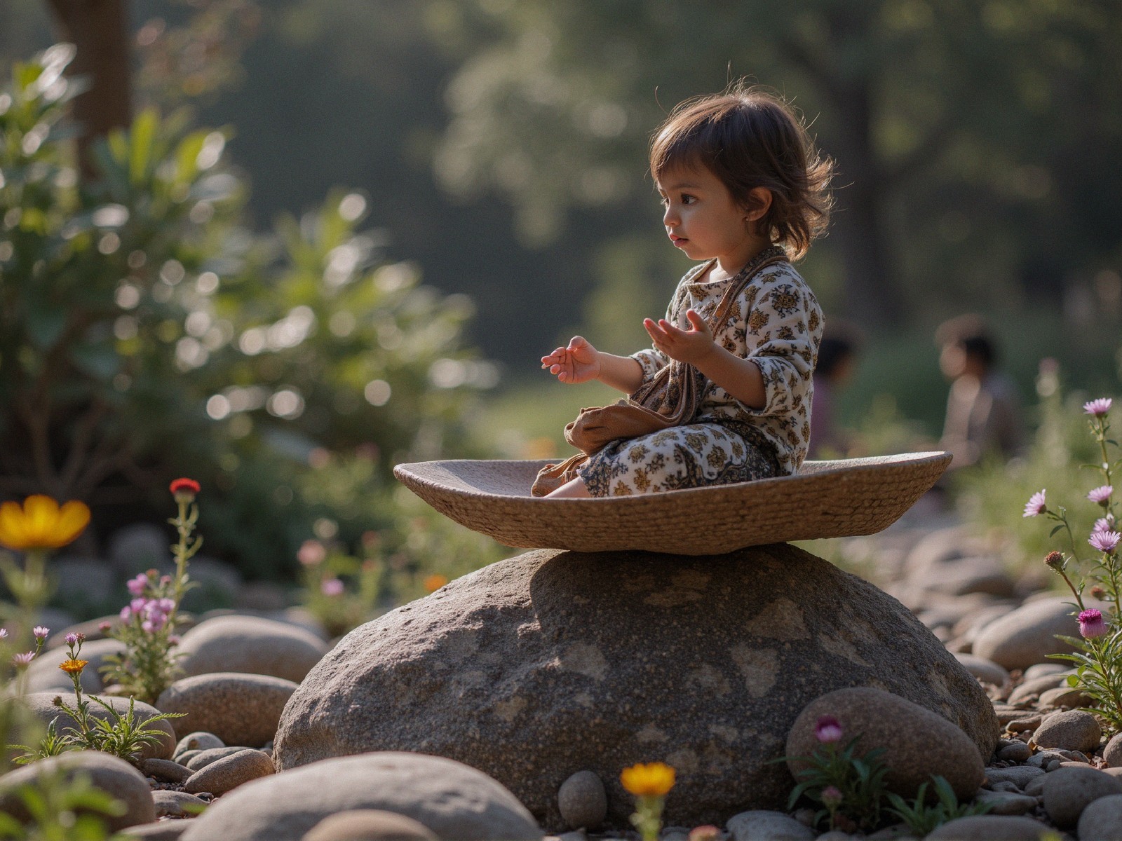 A toddler sits thoughtfully on a stack of stones in a vibrant garden, surrounded by colorful flowers. Soft sunlight filters through the trees, creating a serene and peaceful atmosphere.