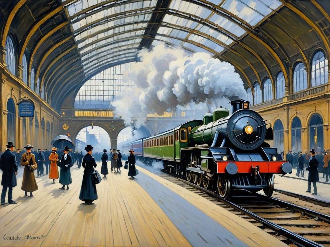 This vibrant Impressionist painting captures a bustling train station scene, featuring a grand structure with arched windows. A steam locomotive puffs smoke as lively figures move about, evoking energy and movement.