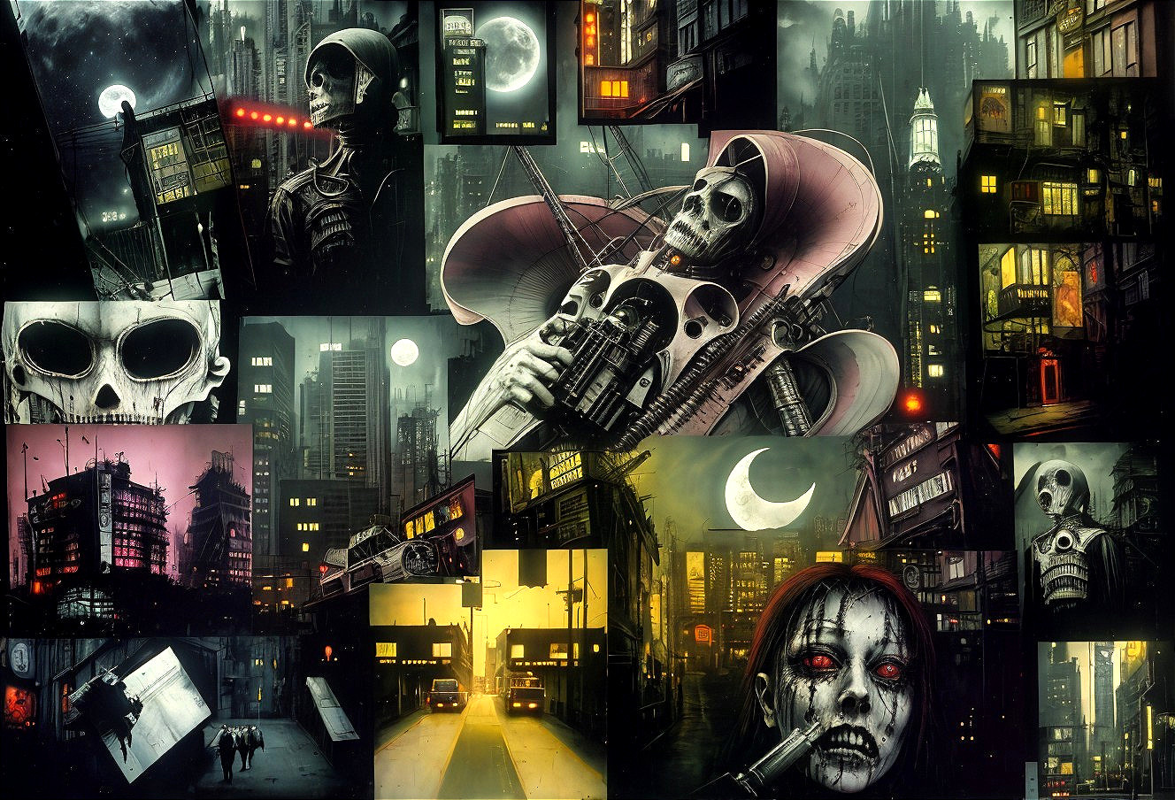 A dark, dystopian collage featuring skull imagery and bleak urban scenes with eerie, atmospheric lighting. I could write a story about it. But I wont. BECAUSE I AM LAZY.