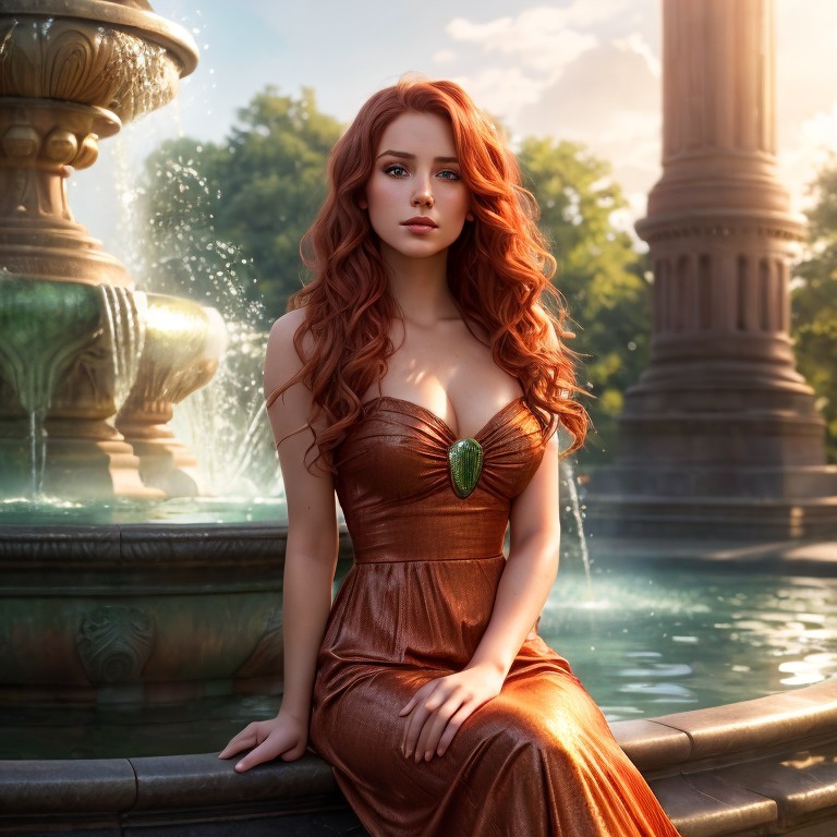 A woman with long red hair sits by a fountain in golden sunlight, dressed in an ornate bronze gown, exuding a serene, mystical aura.