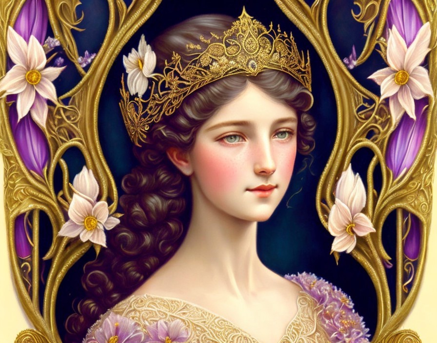 An illustration of a teen-aged girl with a floral crown and ornate frame evoking a fantasy aesthetic. She represents spring, the crescent moon.