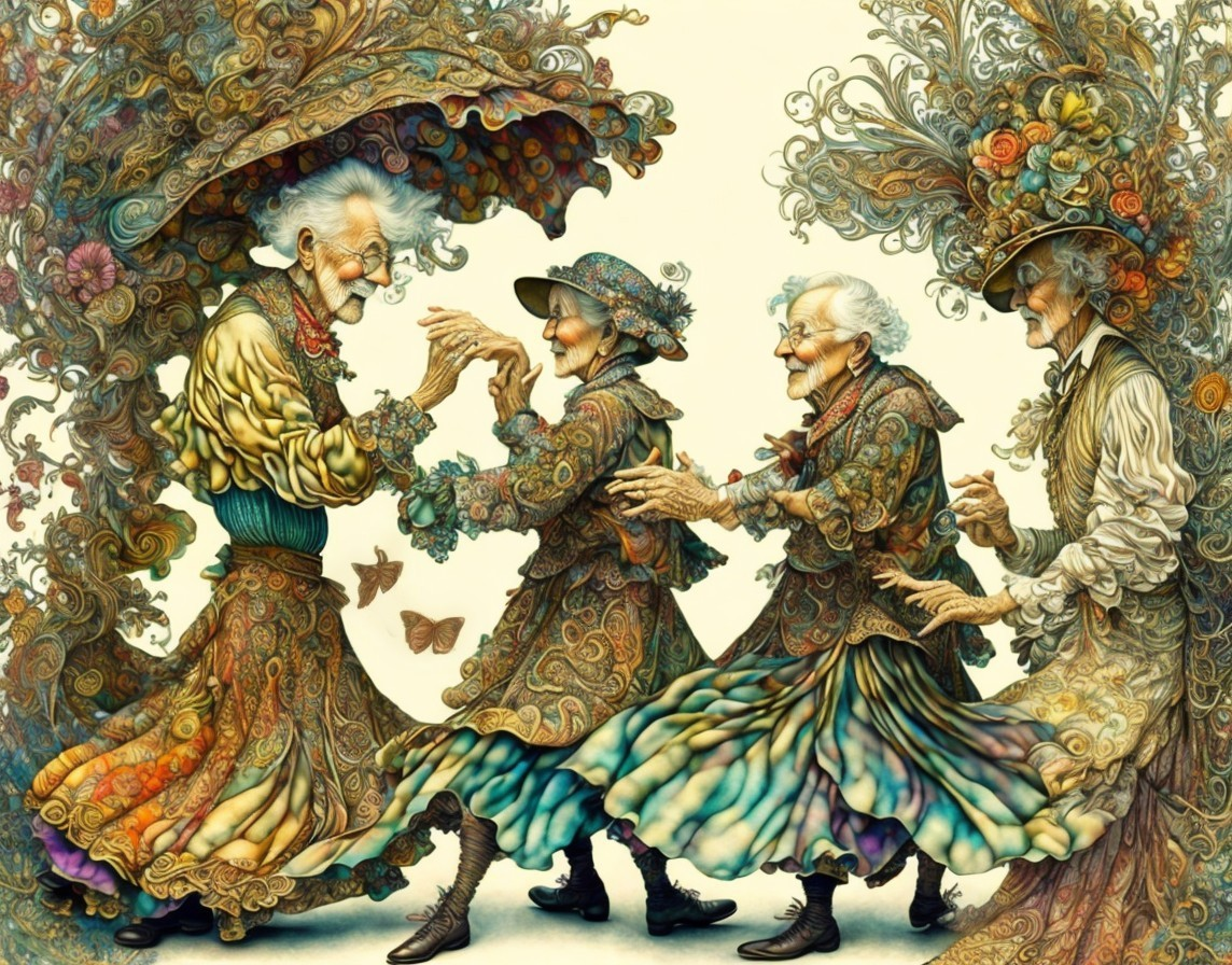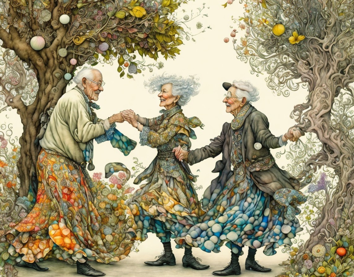 An illustration shows three jovial people in old-fashioned clothing dancing in a whimsical forest.