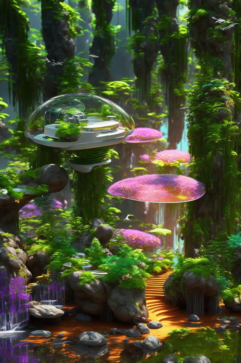 Futuristic forest with lush greenery, floating terrariums, purple foliage, waterfall, wooden