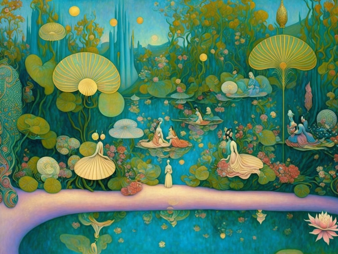 A whimsical underwater scene features ethereal figures in flowing dresses dancing amidst vibrant aquatic plants and flowers. Soft colors and delicate shapes create a dreamlike atmosphere.