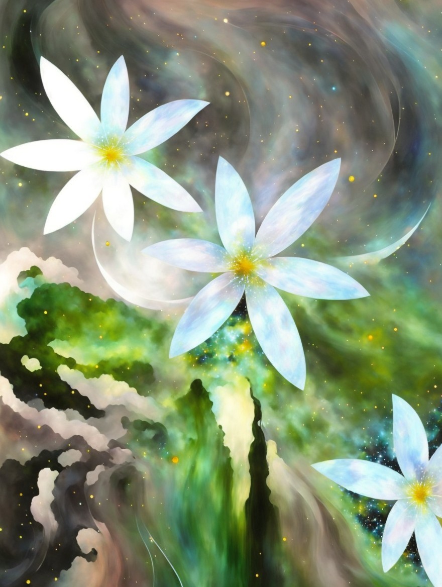 A vibrant digital painting of luminescent white flowers with a starry, celestial background, evoking a magical, serene atmosphere.