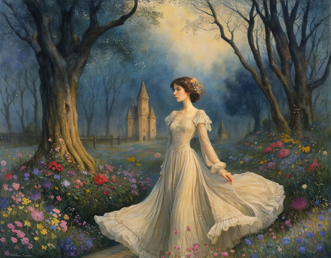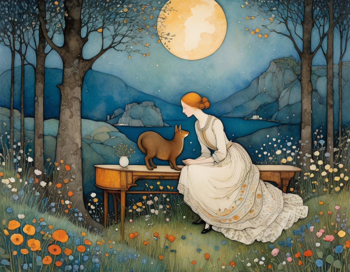 A serene landscape features a woman in a red dress walking along a beach under a large moon. A serene sea reflects the moonlight, while a dog stands nearby and a quaint house nestles on the shore.