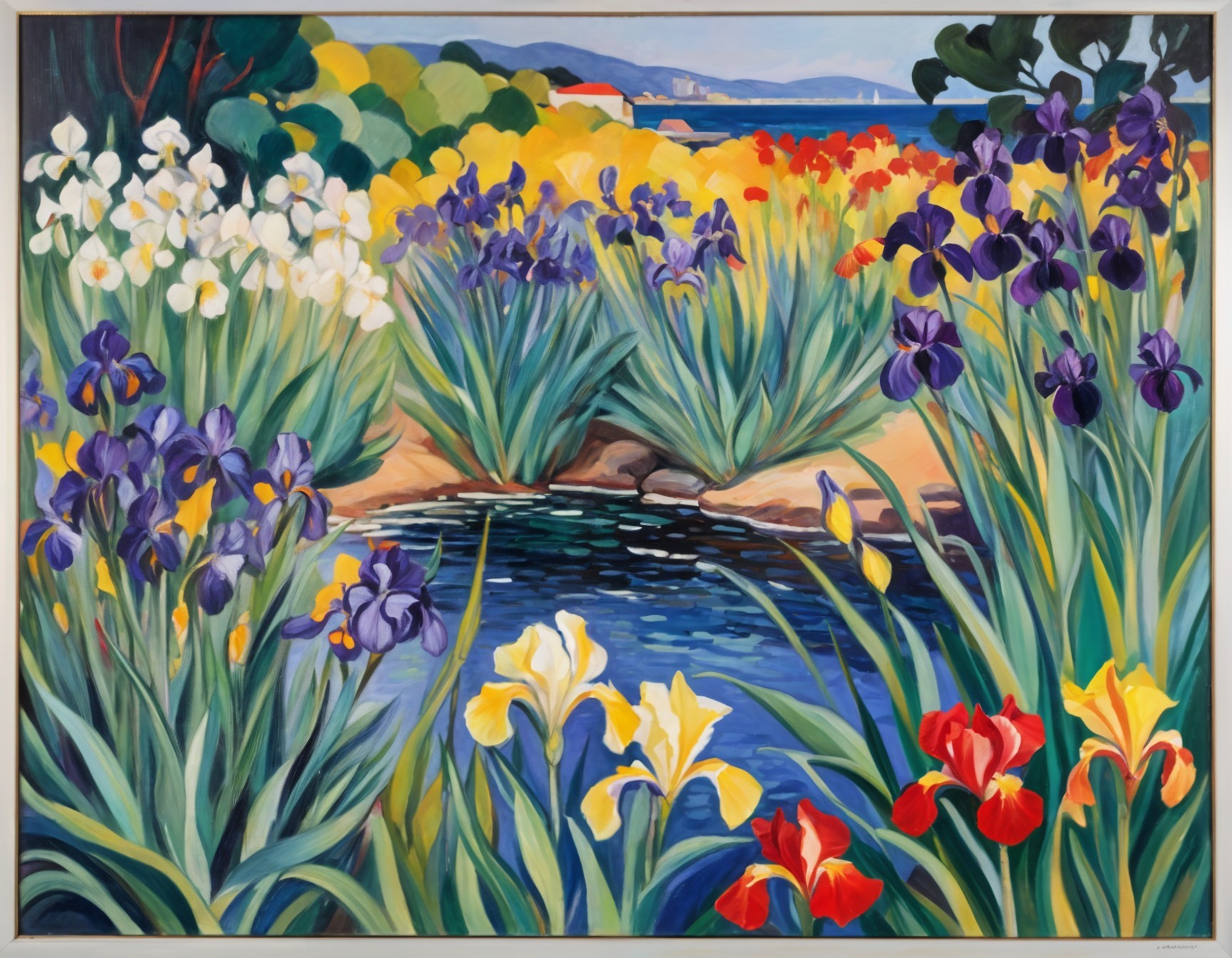A vibrant landscape painting featuring a colorful garden with blooming irises in shades of purple, yellow, and red, set against a serene water body and a distant view of hills and buildings. Prompt by gnat and modified.