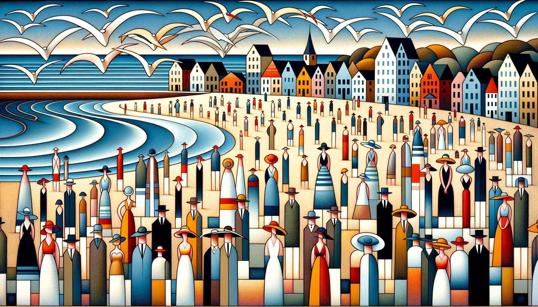A vintage-style illustration of people in early 20th-century beach attire enjoying a sunny day on a bustling seaside promenade.