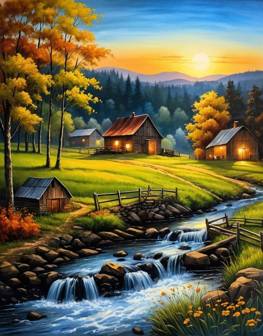 A serene landscape features a cozy cabin and barn nestled among vibrant autumn trees. A gentle stream flows nearby, with mountains in the distance under a warm sunset sky.