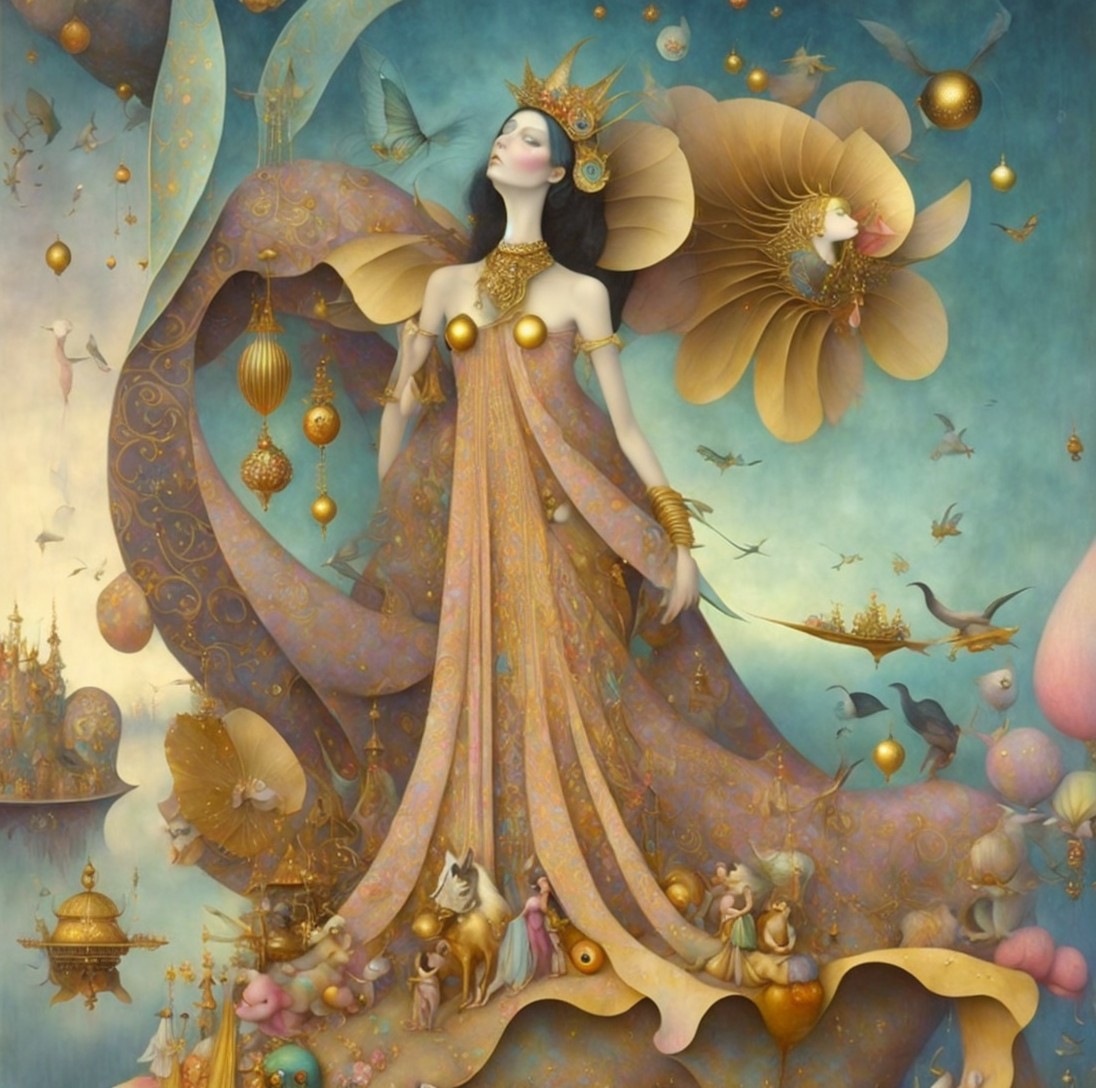 A highly detailed fantasy art image resembling a painting of an elegant woman with black hair, wearing a golden crown and a long, flowing gold and purple gown, holding a golden staff. The woman is set against a soft blue and green background with ethereal golden ribbons, golden spheres, and golden bells hanging in